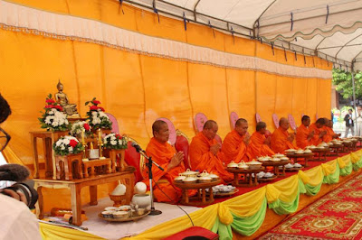 เวลา ๑๐.๐๐ น. พระสงฆ์ ๙ รูป เจริญพระพุทธมนต์ ถวายภัตตาหารเพล และ เครื่อง ปัจจัยไทยธรรม แด่พระภิกษุสงฆ์